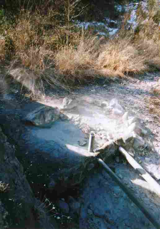 3.N35.13.31 E139.02.12 噴気マーク 湯ノ花沢、鳥居マーク上の噴気帯。本当にあるのか??と疑問。 しかし、温泉があった。ラッキー )^o^( 70℃以上 pH1.7 酸っぱい湯が20L/min位自然湧出している。さまして利用、めでたく一湯だ。