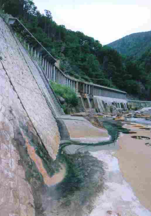 ●前中ノ湯温泉 成分不明 73℃ pH7.2 やや金気味。湯の流れる先は。。。 おっっ!! 一人用の湯船がいっぱいあるぞ!