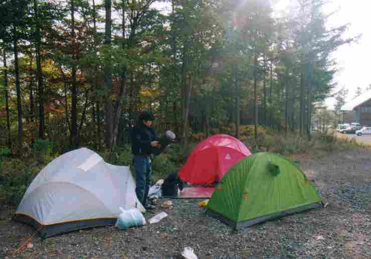 -駐車場隅を拝借してキャンプ 夜は寒かったけど、ホットな宴会でした。 キムチちゃんぽんもグー。 テントを張ってお疲れさまでした。(写真は翌朝)