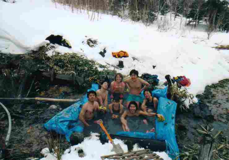 ●新泉組、雪上を跳ねる!(万座編+α) 01.03.17〜18 新泉組に新メンバーも加わりよりにぎやかなりました。 では"石楠花の湯"を目指し出発。(11幕構成) -念願の石楠花の湯に浸かるハイな人たち。 ※参考文献 野湯&源泉宿の旅、温泉ML[onsen-ml:19434]