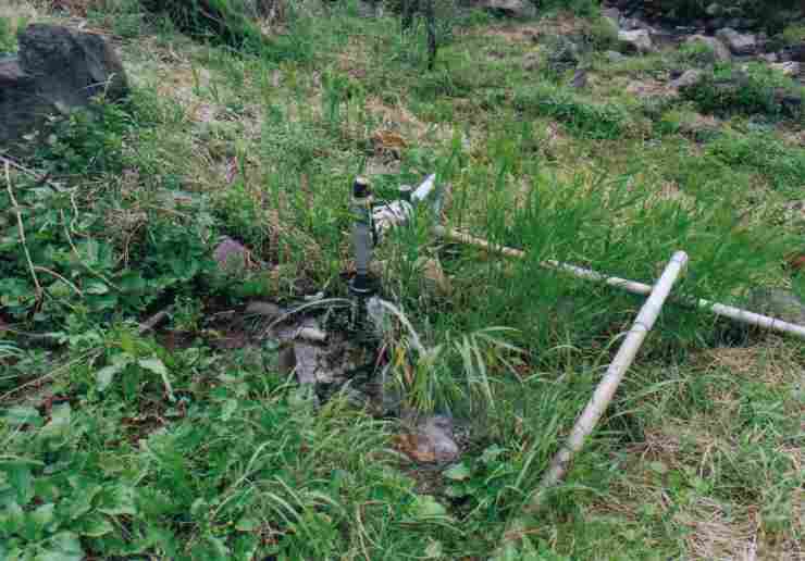 ・法華院温泉 駐車場から歩くこと約2時間で到着した。 -源泉 26℃ pH6.4 数年前の地殻変動で湯温が低下したらしい ちょっと残念。 -掘削中の新源泉 小屋より上部に新源泉を掘削中、今後に期待したい。 深度は確か140mだったような・・・