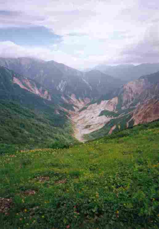 5.降下、用ー意! 8/4(土) テン場発06:10 樅沢岳を登り硫黄乗越まで前進、いよいよ硫黄沢まで降下だ! ヘルメット着用ー。気合いが入るゼ。 (このあとガレ場でピンチになるが何とかクリアした(-_-;))