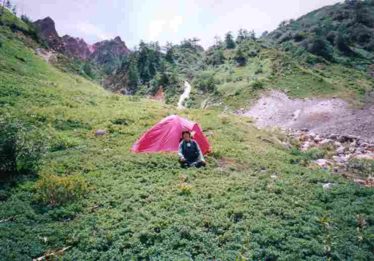 20.地獄のテン場 結局、防毒マスクを着用して寝たテン場。地獄の一夜でした(-.-) バックに白い滝。右の地獄帯から強い硫化水素臭&鉱泉の自然湧出。 雰囲気はいいけど命の保証はまったく無い。