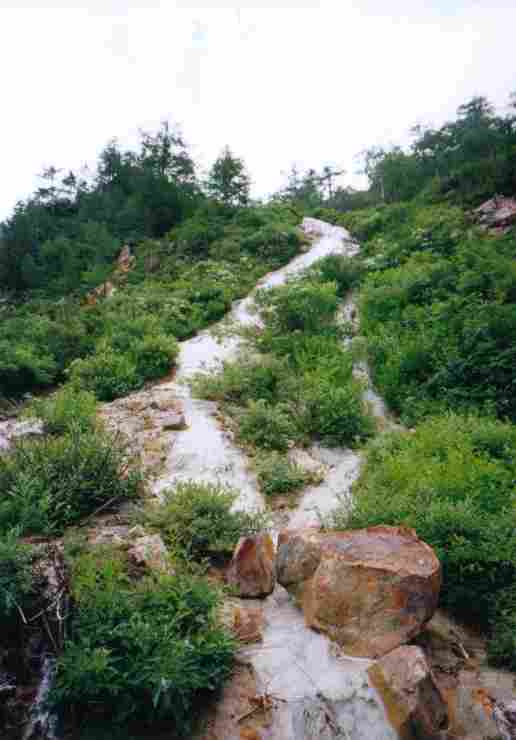 ・白滝鉱泉 N36.22.05 E137.37.44 美しい!の一言。将来天然記念物指定間違いなし。 ※15℃ pH8.6 ※現状維持の為&クマの恐怖の為、滝下で測定。