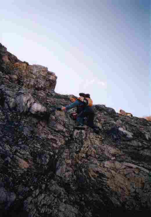 -黄白色の滝。ちょっと期待感、岩を攀じ登る。
