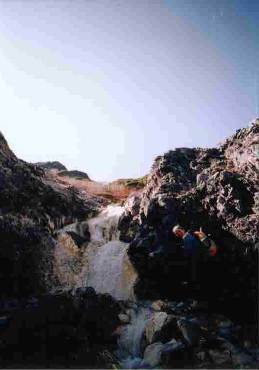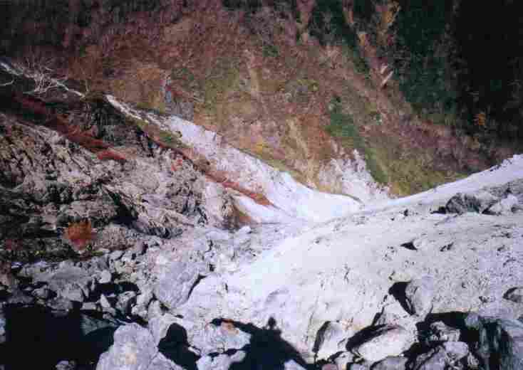 3-(1) 奥湯川地帯 今回調査の本線である。 -脆い斜面をフリーで登る。 -黄白色の滝。ちょっと期待感、岩を攀じ登る。 -上部より撮影、変質帯。 -最上部、湧出地帯。 9℃ pH未測定 弱い酸味あり(味覚的感覚) HS 5〜10ppm/h 高温の湯が出ている1%の可能性に賭けたが、残念ながら冷鉱泉がちょろちょろであった。 硫化水素濃度が予想以上にあり、装備不足なので足早に引き返す。 これで奥湯川の白い滝の調査は完了、この目で確かめられればスッキリ満足。 次は湯川源泉だ!