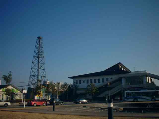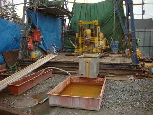 駅真横で掘削している風景 33g/Lの濃厚な食塩泉です。右はドローダウンテスト終了後の写真。※いつも取材に協力して頂き感謝致します。