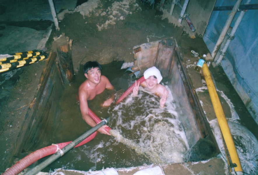 ●地元3本目の大深度 川崎市麻生区 05.07.21 忍び込んでませんよ、荒井先生よりの特別許可です。 -41℃ pH7.4 350L/min 師匠と隊長のツーショット!気が付けば、、ありそうで無かった絵です。 源泉ならばどこでも浸かります。ご機嫌だゼィ〜 では、浴びて下さい。