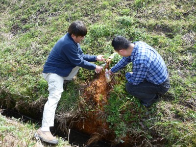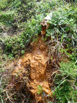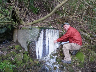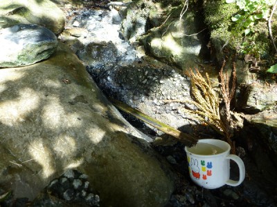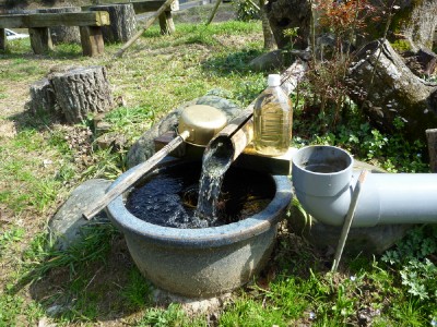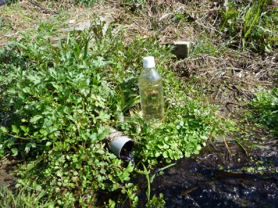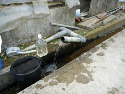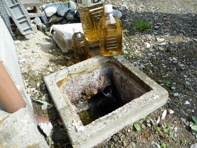 ちょろちょろの硫黄冷鉱泉を必死で集める。一滴入魂です。
