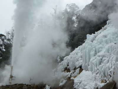 放出された水蒸気が外気に冷やされ、水滴となり落ちて固まり氷柱を造形している。見惚れるいる場合ではない