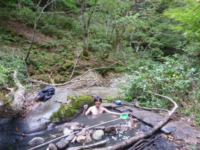 祠から湯が出ている感じです。MT アル単系に硫黄臭 湯量10〜20L/min 湯船を作り尻浴 (^_^;)2. カラノマタ沢温泉 No.2 自然湧出