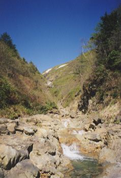 大沢川上流。香草温泉へのアプローチ。白い残雪が残る付近に問題の湯があるのだろうか??