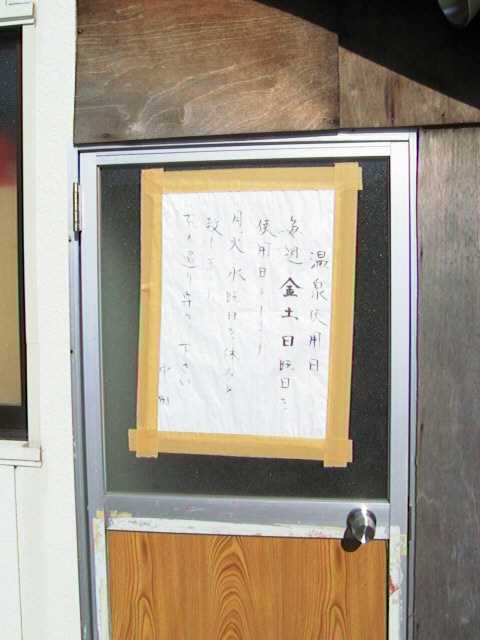 以前テレビで紹介されて以来、ずうっ〜気になっていた温泉です。 出来ることなら入浴したく、お願いしてみようといざ・・・・・ なななんてこった! ! !誰もいない。交渉以前の問題でした。(涙・涙・・・) 利用時間をよく確認しなければ。 金・土・日営業とありました。 露天風呂からの眺めもよさそです。次回再アタックとあきらめその場を後にしました。