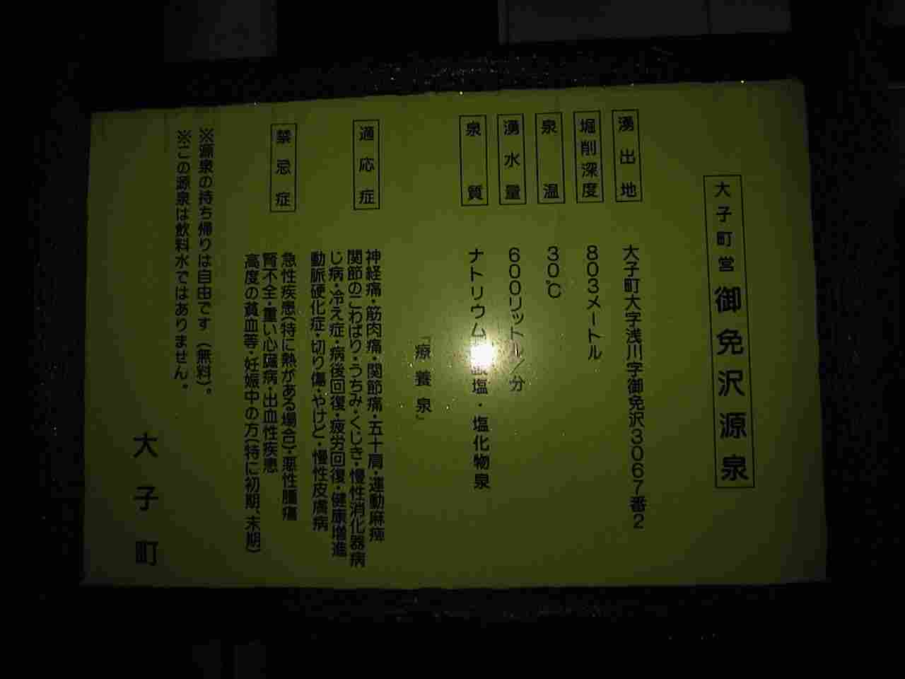 シンプルに蛇口が5ヶ並ぶだけの温泉スタンド(無料) 側溝には大量の湯が流れています。そばには源泉露天風呂のような池があります。 Na・Ca-塩化物泉 30℃ pH8.0 参考までに・・・ 画像暗くて失礼! ! !再度取材します。