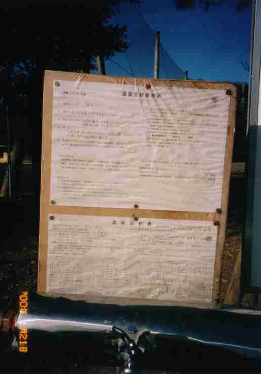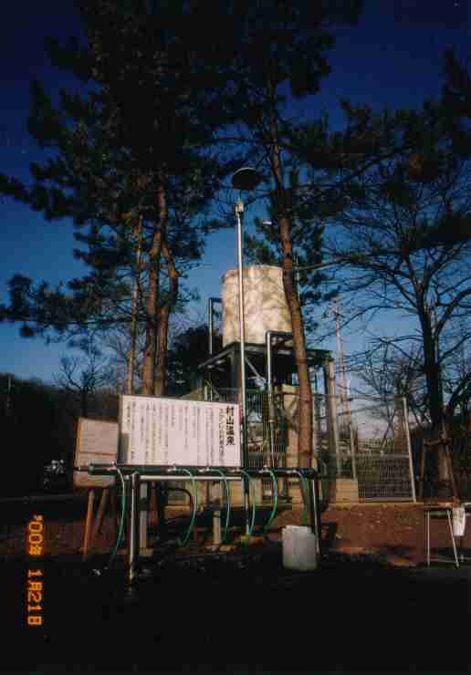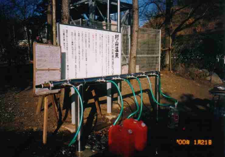 99.10月より村山温泉スタンド開設との情報! ! ! 早速行ってきました。 全景 無料・湯量制限なし 配湯時間9時〜18時 拡大 硫黄臭あり pH9.1 22℃ 実測値 う〜ん、結構いい温泉スタンドじゃありませんか。大人気です。 分析表 確かに温泉です。横には分析表もしっかりあります。 注意書きを無視して、がばかば飲泉しました(まろやか〜)