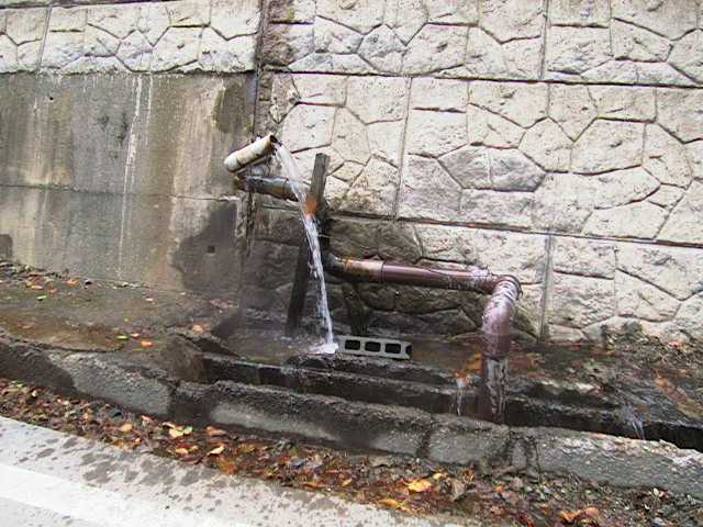 ●中ノ湯付近 長野県南安曇郡安曇村中ノ湯 99.10.30 沢渡地区に温泉が開設しました。6.4キロ先の中ノ湯からの引き湯とあります。 もしかして、これが関係施設でしょうか?? おおっ・・・ ドバドバ出ているぞっ 湯量豊富。38℃ マニアの皆さんどうしますか??ト伝の湯に飽きたらここをススメます(笑い) さすがに、隊長も見学&飲泉のみです。